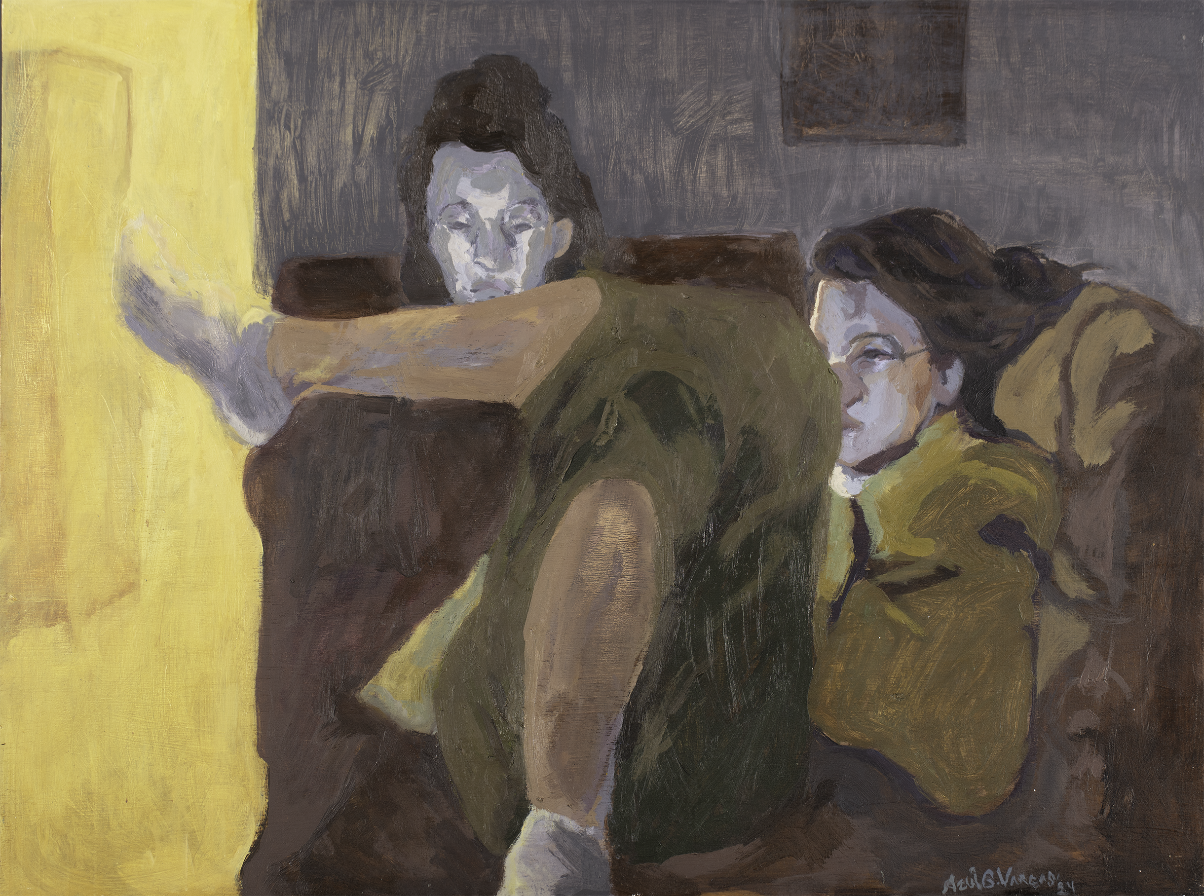 Celia en Palermo captura un instante de intimidad y cotidianeidad con una composición dinámica y expresiva. La obra presenta a dos figuras femeninas en un ambiente doméstico, destacando la postura relajada y despreocupada de la figura principal, cuya pierna elevada aporta una sensación de movimiento. La paleta cromática se compone de tonos terrosos y ocres, con un fuerte contraste de luces cálidas y frías que realzan la atmósfera introspectiva. La pincelada suelta y gestual, junto con las texturas rugosas del fondo, refuerzan la expresividad de la escena, evocando un momento de contemplación y complicidad en un espacio íntimo.