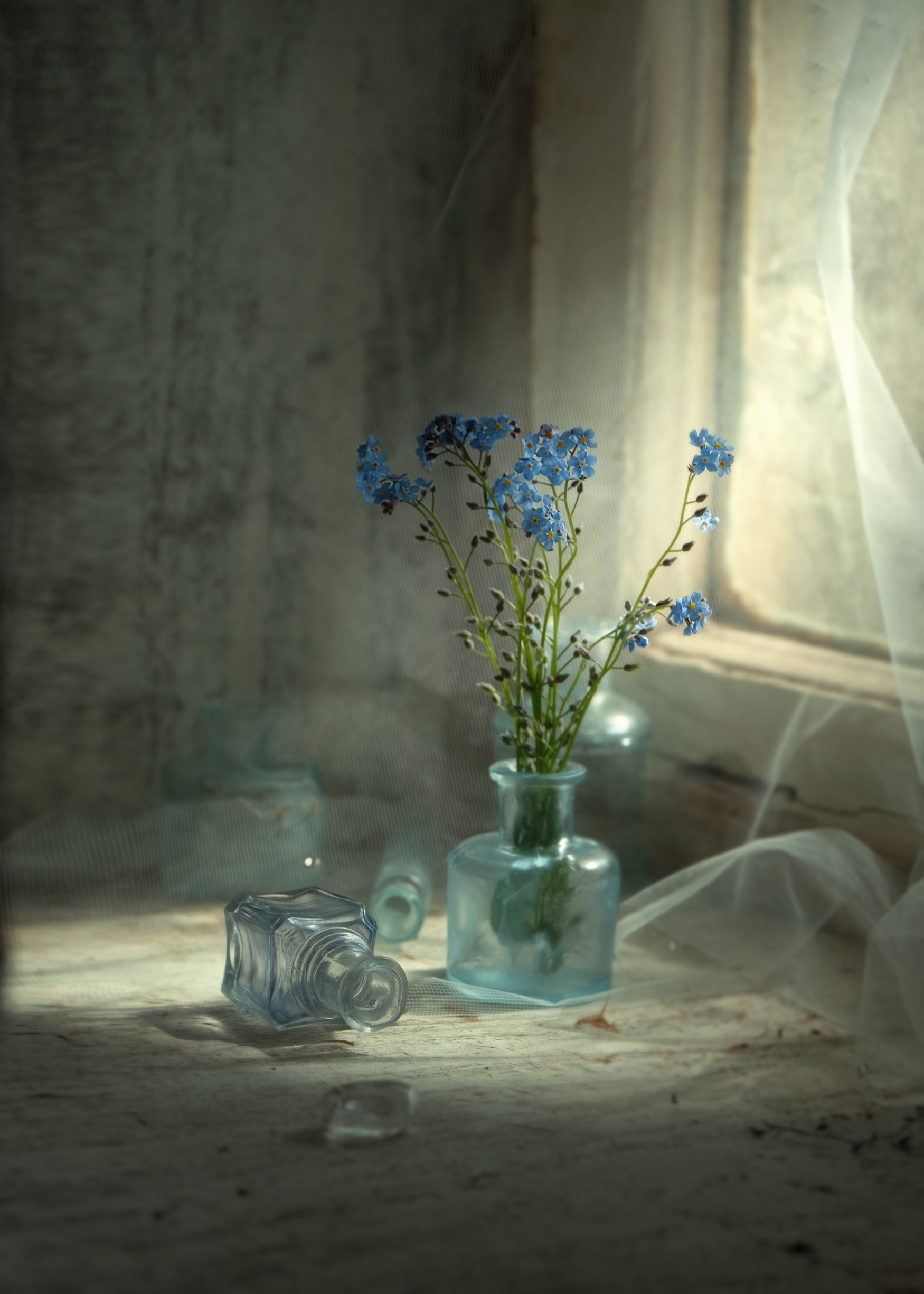 La imagen presenta un bodegón delicado donde el protagonista es un pequeño ramo de flores "no me olvides" (Myosotis) en un jarrón de vidrio azul claro. La composición tiene una disposición aparentemente casual, pero con una clara intención de transmitir quietud y nostalgia. La luz suave y difusa que entra por la ventana crea un contraste tenue entre las flores y el entorno, generando una atmósfera casi etérea. El color dominante es el azul, que, junto con los reflejos del vidrio, otorga frescura y melancolía a la escena. La interacción entre los objetos de vidrio y el tejido translúcido sugiere fragilidad y evanescencia.