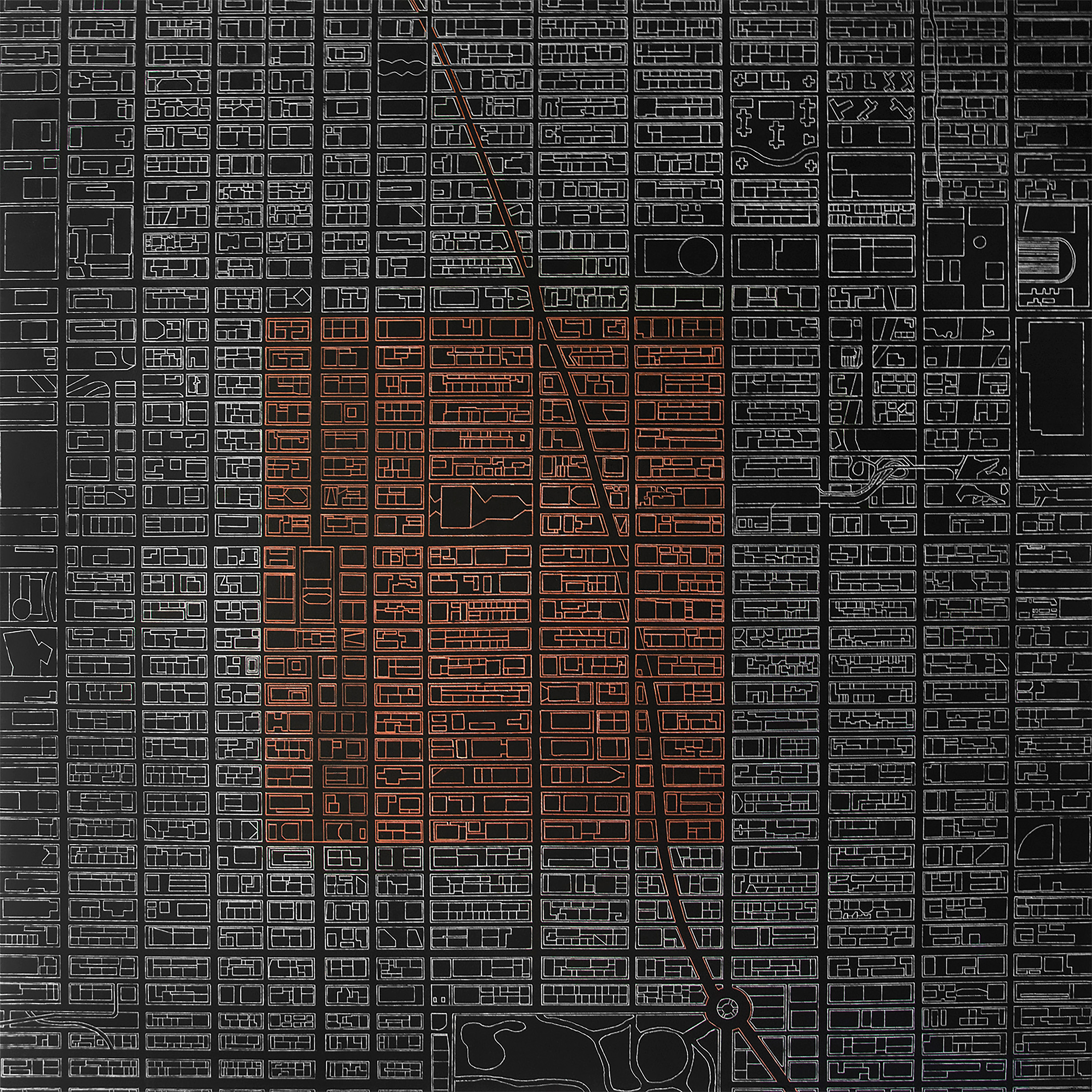 Satellite: Desde una perspectiva satelital, Velasco teje una narrativa sobre la omnipresencia de la estructura en nuestras vidas, con un río naranja que recorre el rígido panorama urbano, aportando movimiento y vida a la composición. En esta obra un tapiz urbano se despliega bajo la mirada de un satélite imaginario, donde cada avenida y plaza se graba en fuego sobre el lienzo de la noche. Este es un mapa de posibilidades, un diagrama del pensamiento humano, una constelación de civilización ardiente en la vastedad del éter urbano.